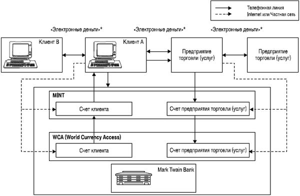 1 – открытие клиентом и предприятием торговли (услуг) банковских счетов (WCA) в Марк Твен Банке и одновременно осуществляется открытие MINT (виртуальных счетов, на которых ведется учет "электронных денег"); 2, 3- клиент посылает запрос о переводе суммы "электронных денег" в Марк Твен Банк. Марк Твен Банк конвертирует безналичные деньги, находящиеся на банковском счете (WCA), в "электронные деньги" и переводит их на виртуальный счет (MINT); 4 – перевод с MINT суммы "электронных денег" на персональный компьютер клиента; 5 – оплата клиентом товаров (работ, услуг) посредством "электронных денег"; 6, 7 – полученная предприятием торговли (услуг) сумма "электронных денег" переводится им на свой виртуальный счет (MINT). Последующая конвертация "электронных денег" в безналичные и зачисление на банковский счет предприятия торговли (услуг) либо, по согласованию с Марк Твен Банк, денежные средства могут быть получены в наличной форме