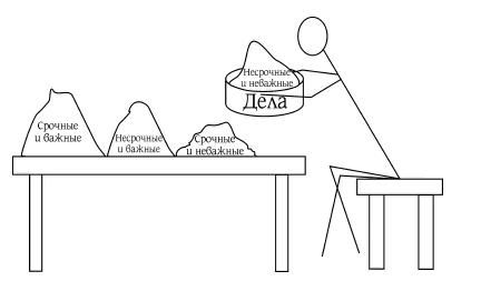 Именно в указанном римскими цифрами порядке их рекомендуется решать. Но в жизни обычно бывает иначе. Надо сказать, срочные неважные дела очень любят меняться местами с важными несрочными. Срочные дела часто связаны с давлением каких-то людей и организаций. Допустим, к менеджеру забегает подчиненный и просит срочно решить какой-то вопрос. Или, когда менеджер собрался заняться важным делом, его отвлекают телефонным звонком. Так в рутинных делах проходит целый день, и менеджер с горечью понимает, что он не успел заняться таким важным делом, как, например, планирование нового проекта.