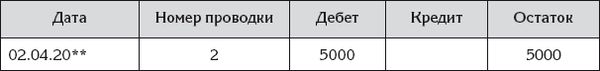 После того как Ирина запишет проводку в журнал проводок, она откроет главную книгу на странице, соответствующей счету дебета проводки, и внесет в таблицу запись, соответствующую этой проводке. В графу Номер проводки она внесет порядковый номер проводки из журнала проводок, в графу Дата проводки – дату проводки, в графу Дебет – сумму проводки, в графу Кредит не внесет ничего. После этого она рассчитает остаток, то есть денежную сумму, которая будет числиться на счете после этой записи.