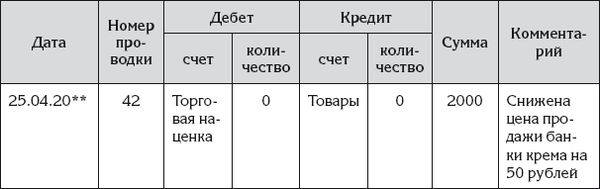 Учетная цена нужна для того, чтобы правильно рассчитать сумму списания со счета. Например, если покупателю передаются 4 банки крема, то со счета Товары надо будет списать сумму 4 × 250 = = 1000 рублей, а со счета Торговая наценка надо будет списать сумму 4 × 50 = 200 рублей.