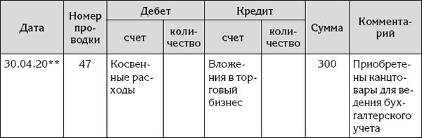 В последний день первого месяца своего торгового бизнеса Ирина стала вспоминать: а не было ли у нее подобных расходов? Да, были. В начале месяца она купила в канцелярском отделе магазина два скоросшивателя, пачку бумаги и еще какую-то мелочовку – специально чтобы вести журнал проводок и главную книгу. За покупки она заплатила 300 рублей, но не из денег, предназначенных для бизнеса, а из денег своего личного хозяйства.