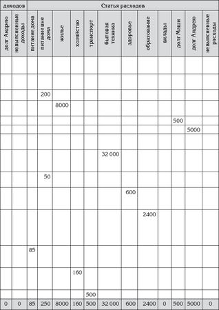 И Ирина решила еще раз усовершенствовать свои записи. Она открыла свою тетрадь на чистом развороте и начертила на всю ширину (то есть на две страницы) новую таблицу, состоящую из двух частей. Левая часть повторила прежнюю Иринину таблицу для записи денежных операций. А в правой части для каждой статьи доходов и расходов Ирина начертила собственный столбец.