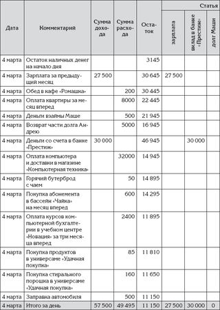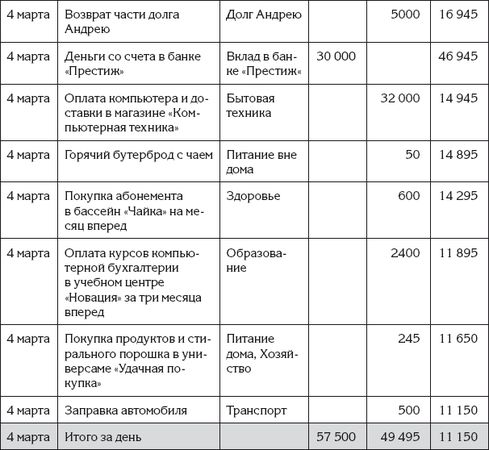 Затем Ирина занесла в эту таблицу денежные операции за прошедший день. Новый вариант Ирининых записей показан в табл. 5.
