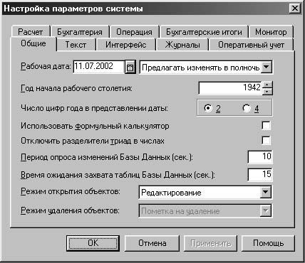 В предыдущем разделе мы рассмотрели ряд параметров, которые влияют на интерфейс программных диалогов и расчетов. Аналогичные параметры задаются в диалоговом окне Настройка параметров системы . Форма диалога представлена в виде блокнота из нескольких страниц и вызывается из меню Сервис командой Параметры . В этом разделе мы рассмотрим только существенные параметры, которые регулируют выборки, задают умолчания для отчетов и т. д.