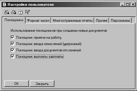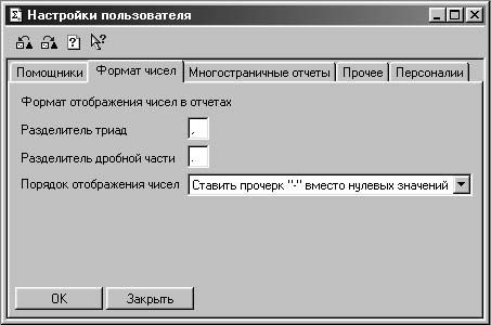 Настройка параметров учета вызывается выбором пункта Настройки пользователя меню Сервис . Обработка предназначена для настройки параметров для каждого пользователя, работающего с программой. Пользователь может указать, будет ли он пользоваться при вводе новых документов услугами соответствующих Помощников . Каждый пользователь может настроить формат отображения чисел в отчетах: порядок отображения чисел, разделитель триад и разделитель дробной части чисел.