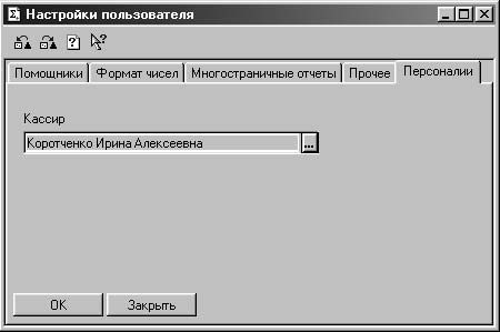 На вкладке Персоналии задается Кассир выбором из справочника "Сотрудники" (рис. 3.21).