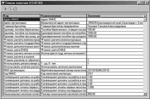 Список всех констант для просмотра и корректировки открывается из меню Справочники выбором пункта Константы (рис. 3.22). Список состоит из трех колонок: