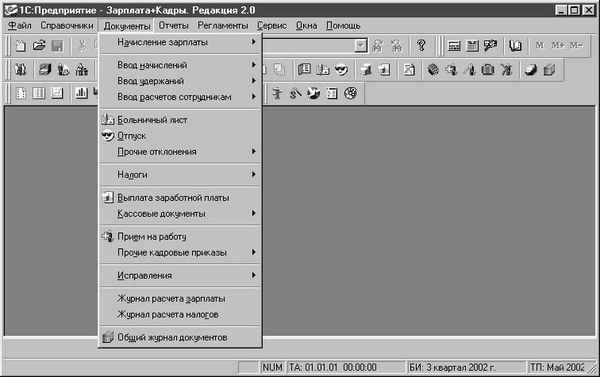 Регистрация изменений данных по сотрудникам и расчетных данных - выплата зарплаты, ведение депонентов, расчеты по больничным листам и отпускам, перемещения сотрудников - проводится при помощи документов. Для ввода новых документов используется меню Документы главного меню программы. Для просмотра и редактирования введенных документов необходимо открыть соответствующий журнал документов.