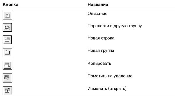 В этой главе, помимо описания основных компонентов программы и их содержимого, мы покажем взаимосвязь компонентов и их влияние на общую работу программы. Для всех компонентов программы определены общие действия, которым назначены определенные кнопки. Желательно запомнить эти кнопки сразу, хотя всегда есть возможность обратиться к меню Действия и выбрать нужное действие из него. Навыки работы с правой клавишей мыши позволяют быстро вызвать это же меню в любом месте окна. В дальнейшем мы будем пользоваться названиями кнопок, приведенными рядом с изображением. Изображения кнопок и соответствующие им действия представлены в табл. 2.1.
