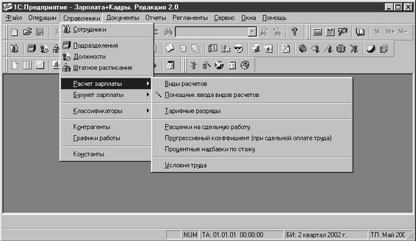 После старта программы в верхней части экрана появится главное меню программы. Выберем меню Справочники и увидим перечень всех справочников, которые описывают объекты нашего учета (рис. 1.1).