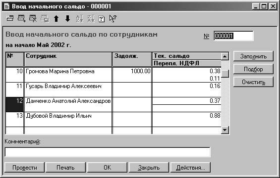 Документ предназначен для ввода сальдо по сотрудникам на начало первого расчетного периода перед тем, как начинать расчет заработной платы. Если на начало расчетного периода у сотрудников имелось сальдо по заработной плате за прошлый и текущий периоды и/или по налогу на доходы, то этот факт нужно отразить в программе. Положительная сумма в колонках Задолж . и Тек. сальдо означает долг предприятия перед работником, отрицательная - наоборот. Положительная сумма в колонке Перепл. НДФЛ означает переплату налога на доходы, отрицательная - долг работника перед бюджетом. В документе вводится список сотрудников (рис. 4.26). В колонке Задолж . указываются суммы накопленной за прошлые месяцы задолженности предприятия по зарплате. В колонке Тек. сальдо проставляется текущее сальдо по заработной плате на начало текущего расчетного периода (положительная сумма для кредитового сальдо, сложившаяся за счет округления при выплате зарплаты, и отрицательная - для дебетового).
