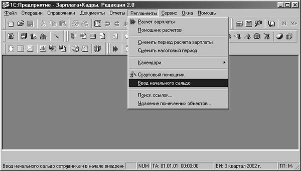 Ввод начальных остатков осуществляется в журнале расчета зарплаты. Документ вызывается из пункта Ввод начального сальдо меню Регламенты (рис. 4.25).