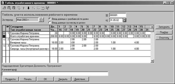 Рис. 4.31. Диалоговое окно Табель отработанного времени с разбивкой по дням
