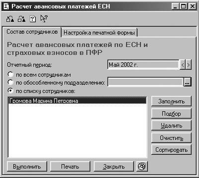 Рис. 5.3. Диалоговое окно Расчет авансовых платежей ЕСН , вкладка Состав сотрудников