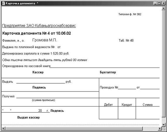 Для формирования карточки депонента при непосредственной выдаче депонированных денег необходимо нажать кнопку Печать (рис. 6.10).
