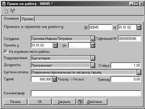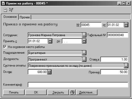 Рис. 7.2. Диалоговое окно Прием на работу, вкладка Основное