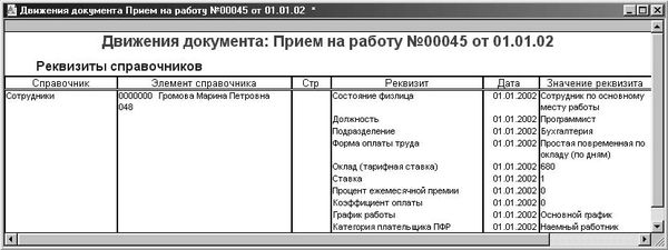 При выборе пункта Движения документа меню кнопки Действия формируется отчет о приеме на работу (рис. 7.10).