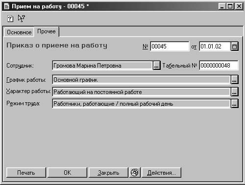 Рис. 7.7. Диалоговое окно Прием на работу , вкладка Прочее