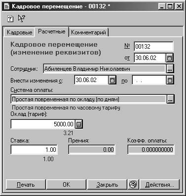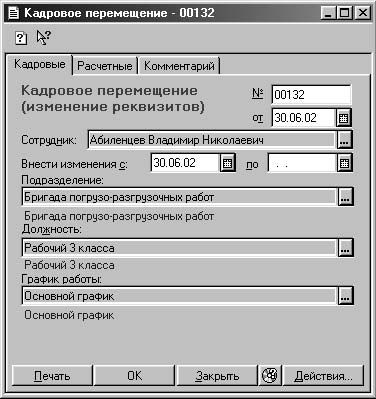 Документом "Кадровые перемещения" производятся все кадровые перемещения сотрудников: перевод на новую должность, в другое подразделение, смена оклада или разряда.
