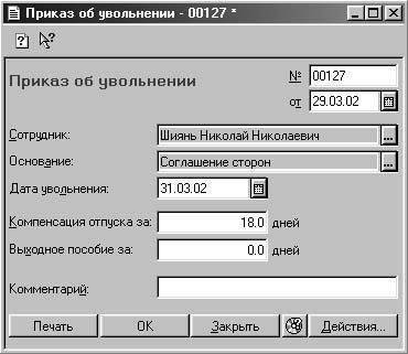 Рис. 7.11. Диалоговое окно Приказ об увольнении