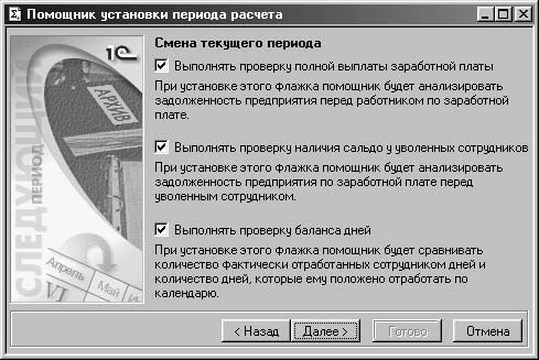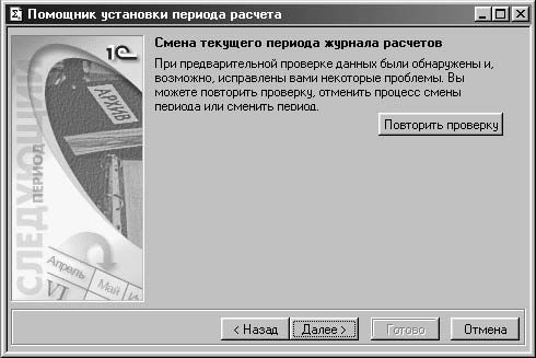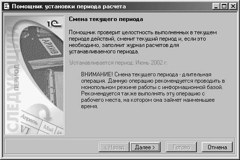 После выбора периода запускается Помощник установки смены периода , который состоит из нескольких этапов. На первом этапе пользователю предлагается диалоговое окно с информацией о процессе смены периода расчета (рис. 8.4).