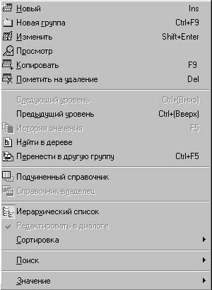 ✓ контекстное меню, появляющееся при щелчке правой кнопкой мыши на строке справочника. Результат действия при выборе из контекстного меню может зависеть от выбранной команды;