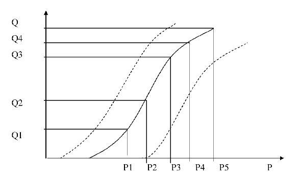 Графическая зависимость между ценой и объемом предложения получила название кривой предложения S (рис. 2).
