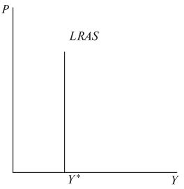 Поскольку в экономике благодаря гибкости цен всегда существует полная занятость и объем производства находится на уровне потенциального ВВП, то кривая совокупного предложения (кривая AS ) вертикальна, отражает равновесие в долгосрочном периоде и обозначается LRAS (long-run aggregate supply) (рис. 3.2).