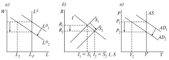 Таким образом, рынки уравновесились сами собой за счет гибкости цен, и равновесие установилось на уровне полной занятости ресурсов. Изменились только номинальные показатели, а реальные остались без изменения (т. е. в классической модели гибкими являются номинальные показатели, а реальные показатели – жесткие ). Это касается и реального объема выпуска (по-прежнему равного потенциальному ВВП), и реальных доходов каждого экономического агента. Дело в том, что цены на всех рынках меняются пропорционально друг другу , поэтому отношение W 1 / P 1 = W 2 / P 2 есть не что иное, как реальная ставка заработной платы. Следовательно, несмотря на падение номинального дохода, реальный доход на рынке труда остается неизменным. Реальные доходы сберегателей (реальная ставка процента) также не изменились, поскольку номинальная ставка процента снизилась в той же пропорции, что и цены. Реальные доходы предпринимателей (выручка от продаж и прибыль) не снизились, несмотря на падение уровня цен, поскольку в той же степени снизились издержки (расходы на оплату труда, т. е. номинальная ставка заработной платы). При этом падение совокупного спроса не приведет к падению производства, так как снижение потребительского спроса (в результате падения номинальных доходов на рынке труда и роста величины сбережений на рынке капитала) будет компенсировано увеличением инвестиционного спроса (в результате падения ставки процента на рынке капитала).