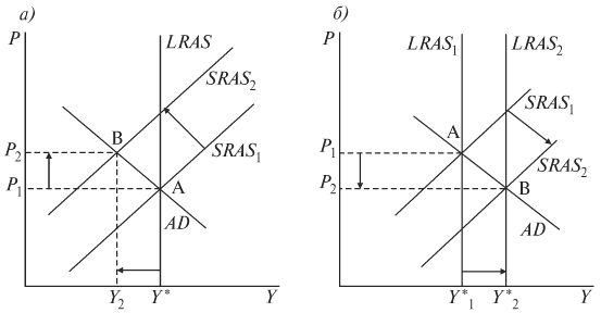 Позитивные шоки совокупного спроса сдвигают кривую AD вправо. Позитивные шоки совокупного предложения сдвигают кривую AS: вниз , если она имеет горизонтальный вид ( SRAS ); вправо вниз , если она имеет положительный наклон ( SRAS ); вправо , если она вертикальна ( LRAS ).