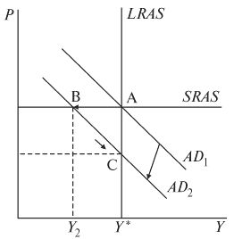 Противоположными являются последствия негативного шока (резкого сокращения) совокупного спроса (рис. 3.11), причинами которого могут быть либо неожиданное сокращение предложения денег (сжатие денежной массы), либо резкое сокращение совокупных расходов. В краткосрочном периоде это ведет к уменьшению объема выпуска и означает переход экономики из точки А в точку В – точку краткосрочного равновесия (снижение совокупного спроса, т. е. совокупных расходов, обусловливает увеличение запасов фирм, затоваривание, невозможность продать произведенную продукцию, что служит причиной свертывания производства). Появляется рецессионный разрыв выпуска – ситуация, когда фактический ВВП меньше потенциального ( Y 2 < Y *). В условиях совершенной конкуренции предприниматели начнут снижать цены на свою продукцию, уровень цен снизится (от Р 1 до Р 2), т. е. произойдет дефляция (в экономической литературе поэтому можно встретить понятие дефляционного разрыва ), величина совокупного спроса увеличится (движение вдоль кривой AD ), и экономика попадет в точку С – точку долгосрочного равновесия, где объем производства равен потенциальному.