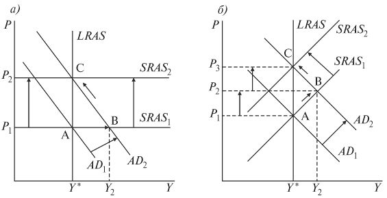 Причинами позитивных шоков совокупного спроса могут быть либо резкое непредвиденное увеличение предложения денег, либо неожиданное резкое увеличение любого из компонентов совокупных расходов (потребительских, инвестиционных, государственных или иностранного сектора). Механизм и последствия воздействия позитивного шока совокупного спроса на экономику фактически рассмотрены выше (рис. 3.10), и в краткосрочном периоде проявляются в виде инфляционного разрыва выпуска, когда фактический ВВП превышает потенциальный ( Y 2 > Y *), что в итоге ведет к росту уровня цен (инфляции).