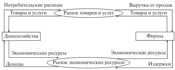 Домохозяйства покупают товары и услуги (т. е. предъявляют спрос на товары и услуги), которые производят фирмы и поставляют на рынок товаров и услуг (т. е. обеспечивают предложение товаров и услуг). Чтобы производить товары и услуги, фирмы закупают экономические ресурсы – труд, землю, капитал и предпринимательские способности (т. е. предъявляют спрос на экономические ресурсы), собственниками которых являются домохозяйства (которые обеспечивают предложение экономических ресурсов).