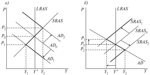 Теперь рассмотрим экономический цикл, обусловленный изменениями совокупного предложения (совокупного выпуска) (рис. 4.3, б ). В условиях, когда спад в экономике вызывается не сокращением совокупного спроса (совокупных расходов), а уменьшением совокупного предложения, большинство показателей (реальный ВВП, уровень безработицы, величина совокупных доходов, запасы фирм, объем продаж, прибыль фирм, налоговые поступления, объем трансфертных выплат и др.) ведет себя так же, как и в первом случае. Исключение составляет показатель общего уровня цен, который повышается по мере углубления спада и обусловливает ситуацию "стагфляции" – одновременного спада производства (от Y * до Y 1) и роста уровня цен (от Р 0 до Р 1). Основу для выхода из подобного спада составляют инвестиции, поскольку они увеличивают запас капитала в экономике и создают условия для роста совокупного предложения (сдвиг кривой SRAS 1 вправо до SRAS 0).