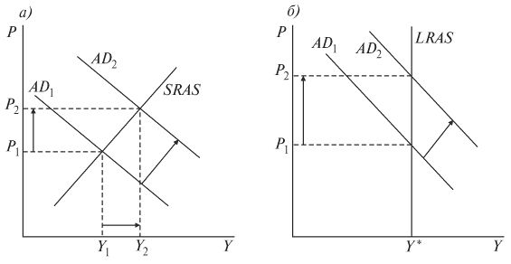 Увеличение совокупного спроса ведет к росту уровня цен и в краткосрочном периоде (поскольку в соответствии с современными представлениями кривая совокупного предложения имеет положительный наклон), и в долгосрочном периоде (которому соответствует вертикальная кривая совокупного предложения) (рис. 6.2). При этом в краткосрочном периоде (рис. 6.2, а ) инфляция (рост уровня цен от Р 1 до Р 2) сочетается с ростом реального выпуска (от Y 1 до Y 2). В долгосрочном периоде (рис. 6.2, б ) реальный выпуск не меняется и находится на своем естественном (потенциальном) уровне Y *.