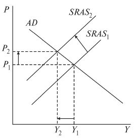 б) инфляцию издержек , причиной которой является сокращение совокупного предложения, что происходит, как известно, в результате роста издержек . Инфляция издержек ведет к стагфляции (рис. 6.3) – одновременному спаду производства (от Y 1 до Y 2) и росту уровня цен (от Р 1 до Р 2).