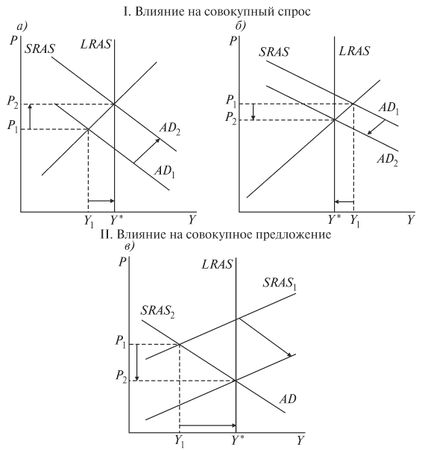 Заметим, что снижение налогов и увеличение трансфертов ведет к росту не только совокупного спроса, но и совокупного предложения. В этом случае происходит не только рост совокупного выпуска (от Y 1 до Y *), но и снижение уровня цен (от Р 1 до Р 2) (рис. 12.1, в ). Поэтому данные инструменты могут использоватьс я в качестве средства борьбы одновременно и с безработицей, и с инфляцией.