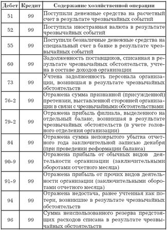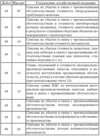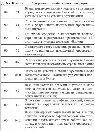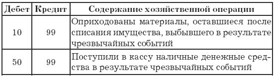 Отметим, что в числе прочих расходов и доходов отражаются так называемые чрезвычайные расходы и доходы. Чрезвычайные расходы, как видно даже из названия, возникают вследствие чрезвычайных ситуаций, т. е. ситуаций, которые, как правило, нельзя ни предвидеть, ни предотвратить разумными средствами. Это стихийные бедствия, техногенные катастрофы, действия правительства (национализации, введение блокад, чрезвычайных положений, объявление военного положения и т. д.). А к чрезвычайным доходам относятся доходы, полученные в результате ликвидации (полной или частичной) ущерба, нанесенного чрезвычайными обстоятельствами. Предположим, что в результате стихийного бедствия пострадала автомашина (основное средство), т. е. имеют место чрезвычайные расходы. Но при этом из не подлежащей восстановлению машины удалось изъять некоторые детали, пригодные для дальнейшего использования в качестве запчастей. Оприходование этих запчастей и будет являться чрезвычайным доходом. Сюда же можно отнести и страховые возмещения убытков, понесенных в результате чрезвычайных ситуаций. Автор искренне надеется, что применять знания, полученные из этого абзаца, вам не придется.