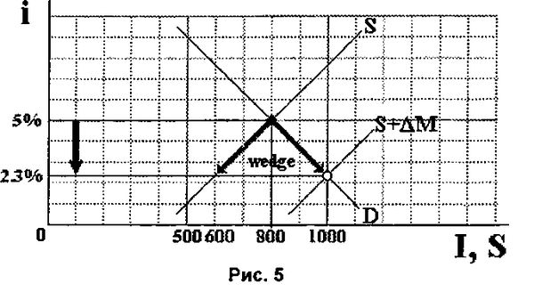 Посмотрите на этот треугольник (рис. 5). Двигаясь вдоль по кривой спроса, увеличивают инвестиции, двигаясь по кривой предложения, уменьшают сбережения, а основание треугольника - это, разумеется, количество денег, созданное ФРС и закачанное в кредитный рынок. Они заполняют клин, вбитый между сбережениями и инвестициями. Это механизм экономического цикла, открытый австрийской школой. Людвиг фон Мизес ввел терминологию, описывающую данный процесс. Он писал, что искусственный бум характеризуется (неоднократно используя эти термины в своей книге "Человеческая деятельность") ошибочными инвестициями [malinvestment] и избыточным потреблением [overconsumption]. Ошибочные инвестиции означают инвестиции, нацеленные в слишком отдаленное будущее, избыточное потребление означает увеличение потребления за счет снижения нормы сбережений [вызванного искусственно низкой процентной ставкой].