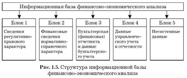 Информационное обеспечение процесса финансово-экономического анализа – это совокупность информационных ресурсов и способов их организации, необходимых и пригодных для реализации аналитических процедур, обеспечивающих финансовую сторону деятельности предприятия. Его основу составляет информационная база, в состав которой входят пять укрупненных блоков (рис. 1.5).
