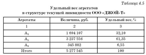Исходя из того, что при расчете Кт.л. используются следующие агрегаты: А1, А2, А3, П1, П2, – рассчитаем удельный вес агрегатов в структуре ликвидности (см. табл. 4.5).