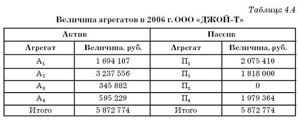 Поскольку одни виды активов обращаются в деньги быстрее, другие – медленнее, необходимо группировать активы предприятия по степени их ликвидности, т. е. по возможности обращения в денежные средства (см. табл. 4.4). Для факторного анализа ликвидности воспользуемся данными табл. 4.1 "Аналитический баланс ООО "ДЖОЙ-Т"".