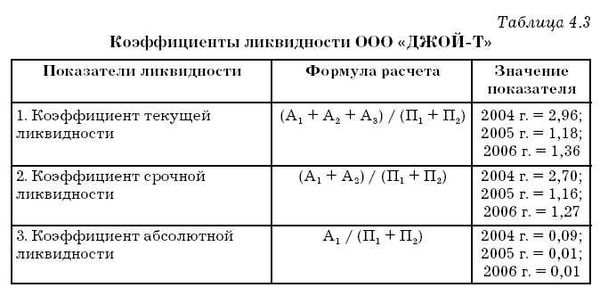 Рассчитаем коэффициент текущей ликвидности на предприятии ООО "ДЖОЙ-Т" по годам на основании данных аналитического баланса (см. табл. 4.1).