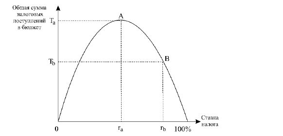 Кривая А. Лаффера - график, показывающий функциональную связь между налоговыми ставками и объемом налоговых поступлений, выявляющий такую ставку, при которой налоговые поступления достигают максимума и создаются наиболее благоприятные условия для предпринимательства.