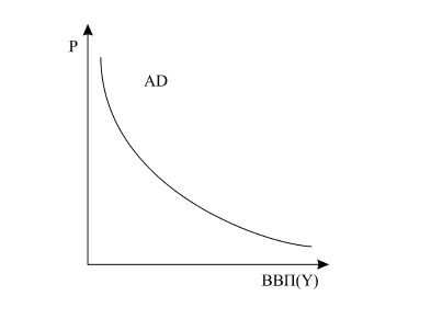 Совокупный спрос можно представить в виде кривой AD, где по оси ординат откладывается уровень цен (Р), а по оси абсцисс – не номинальный, а реальный продукт, т. е. выраженный в ценах базового года (рис. 2).