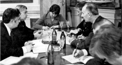Решающая встреча А. Ишкова с норвежским министром по морскому праву и рыболовным границам Е. Эвенсеном во время переговоров в Москве в 1978 году по смежному участку Баренцева моря. В центре – переводчик Е. Лукашова, слева от нее – министр А. Ишков, представитель Северного бассейна В. Зиланов, напротив А. Ишкова – министр Е. Эвенсен, переводчик П. Мур