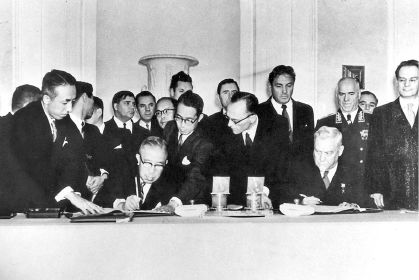 Подписание советско-японской декларации 1956 года. От имени Советского Союза декларацию подписал председатель правительства Н. Булганин, от Японии – премьер-министр Хато-ямо. Крайний справа – маршал Г. Жуков, четвертый слева – министр рыбной промышленности А. Ишков