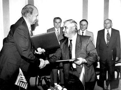 Главы делегаций США посол Т. Пикеринг и России заместитель руководителя Росрыболовста В. Зиланов скрепляют договоренность по Охотскому морю крепким рукопожатием