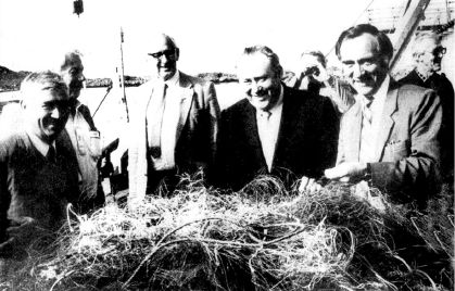 Министр рыбного хозяйства СССР Н. Котляр и экс-министр рыболовства Норвегии Э. Болле осматривают браконьерские сети на Лофотенских островах. Крайний справа – переводчик П. Мур, крайний слева – заместитель министра рыбного хозяйства СССР В. Зиланов