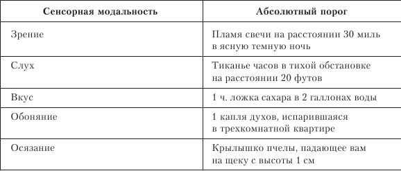Мы видим, как солнце восходит на востоке и заходит на западе, но на самом деле оно никогда не восходит и не заходит. Известно, что очевидцы часто совершенно по-разному "видят" сцену преступления и, соответственно, дают различные показания. Данные феномены восприятия иллюстрируют тот факт, что воспринимаемый мир – не реальный мир, тем не менее – это мир, который мы знаем и на который мы соответственно реагируем. Воспринимаемый мир есть чувственное отражение реального. Это ощущение так сильно, что мы редко задаемся вопросом, что мы видим. Вообще говоря, когда другие люди воспринимают вещи не так, как это делаем мы, мы часто полагаем, что они либо неразумны, либо не правы. Воспринимаемый мир – это фрагмент реального, воспринимаемый человеком с помощью пяти органов чувств: зрения, слуха, вкуса, осязания и обоняния, которые имеют существенные физические ограничения, предохраняющие от переизбытка информации и позволяющие поэтому лучше воспринимать необходимую информацию. Табл. 2.1.1 дает представление о природной ограниченности наших органов чувств. Работая в качестве фильтра, восприятие позволяет человеку отобрать и увидеть только те элементы внешней среды, которые относятся к данной ситуации, т. е. фокусируя и определенным образом организуя часть элементов внешней среды в ситуацию.